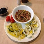 One if my favorite kinds of meals: summer vegetables front and center! Summer squash, zucchini and onions, purple hull peas, hard boiled eggs from our own chickens, tomatoes from our garden plus blackberry jello made from real blackberries we picked!